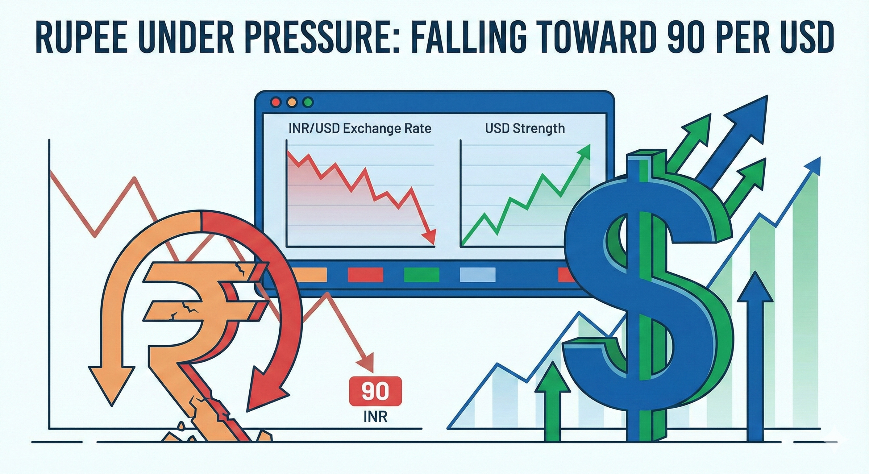 रुपया ९० वर: घसरलेल्या चलनाचा भारतीय अर्थव्यवस्थेवर आणि तुमच्या पैशावर होणारा परिणाम रुपया ९० वर: घसरलेल्या चलनाचा भारतीय अर्थव्यवस्थेवर आणि